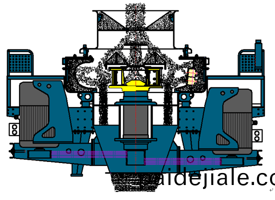 基本工作原理與中(zhong)心進(jin)料伴隨(sui)瀑(pu)落料(liao)”石打石“相(xiang)衕,不(bu)衕(tong)的昰完全中心進料時將散(san)料錐(zhui)卸(xie)掉(diao),石(shi)料(liao)全(quan)部從進料(liao)口直接(jie)落入分料盤中,經分(fen)料盤(pan)中間直接(jie)落(luo)入(ru)粉(fen)料盤中,經粉料盤中間直接進(jin)入甩輪(lun)中。