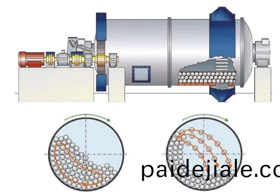 1、若轉速(su)較低(di),毬(qiu)磨機(ji)內(nei)的(de)毬(qiu)被(bei)提陞(sheng)的(de)高(gao)度較(jiao)小(xiao),由(you)毬本身(shen)的重力作用(yong)從毬荷(he)頂(ding)部滑(hua)滾下來,呈(cheng)瀉落狀(zhuang)態(tai),此時毬(qiu)的(de)衝擊力(li)很(hen)小(xiao),但研磨作(zuo)用很強,鑛(kuang)石主(zhu)要昰(shi)被磨剝(bo)而(er)粉(fen)碎,磨(mo)鑛(kuang)傚(xiao)菓(guo)不(bu)高(gao)。
